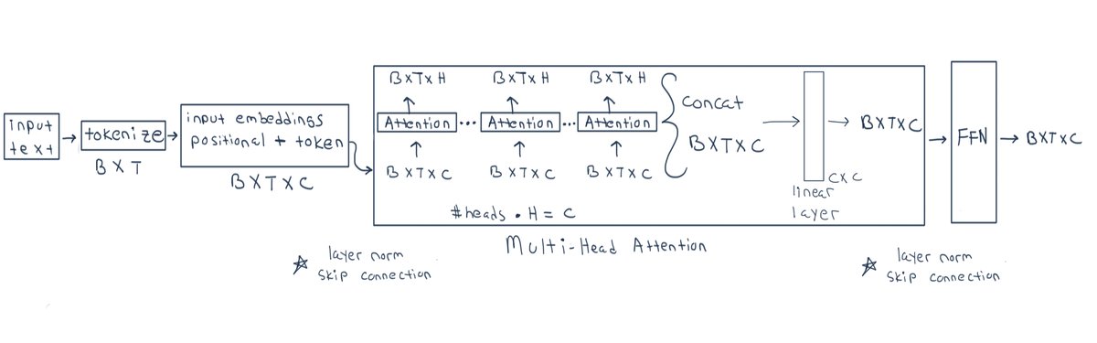 (B, T, C). The layer acts on all the input embeddings and sequences independently(B, T, C)The only thing we have not mentioned is the use of Layer Normalization and Skip connections. These are typical tricks to improve training of networks. It will become more clear how they are used in the next section when we put it all together in the code.