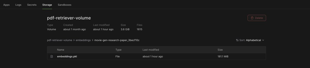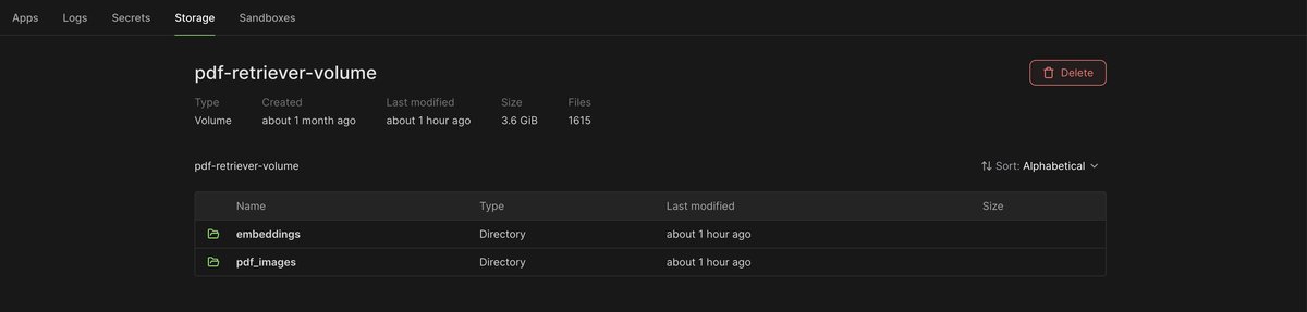 Since I am only allowing to ask questions about a single PDF at a time, there is no need for fancy vector DBs etc. The embeddings for a specific PDF are cached and can be loaded into memory very quickly when needed. When a new PDF comes along that is not cached, we process it, and then store the images and embeddings in the volume. You can see all the details about PDF processing and ColPali inference in the PDFRetriever class.