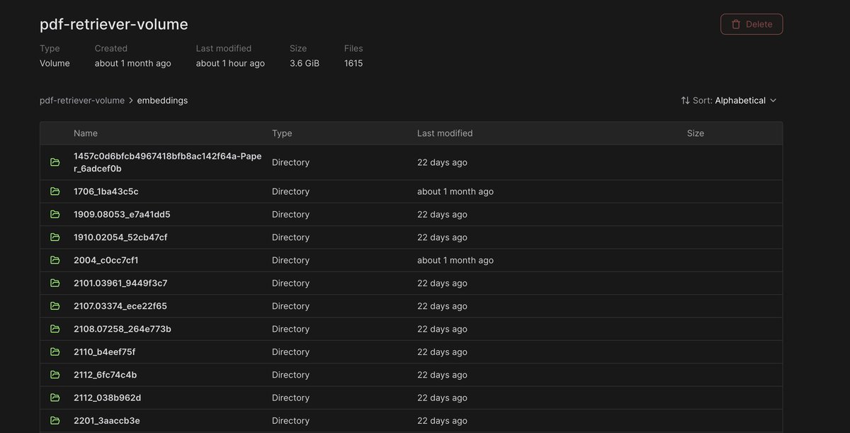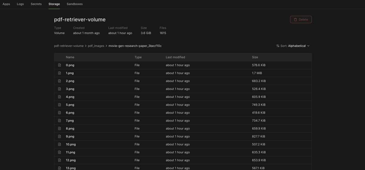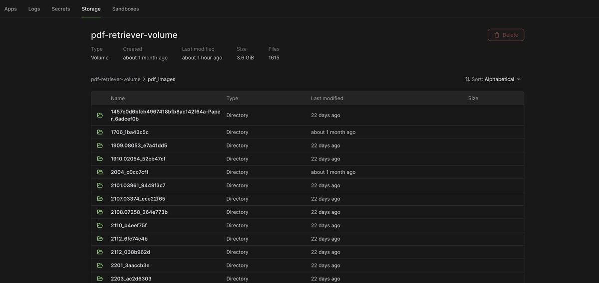 Another highlight is the use of Modal's volume functionality. I use a volume to store the images and document embeddings for each PDF that is processed. This way if the PDF is used a second time, the images and embeddings are stored to the Volume for fast retrieval. This avoids having to call ColPali processing and PDF processing for each question/query related to the same document.