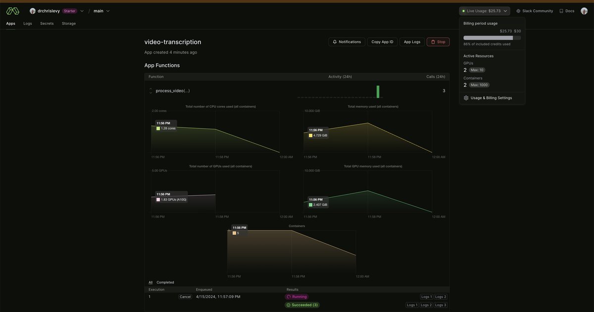 I hope this got you excited to go and try out Modal. They actually give you $30 of compute each month. And the dashboard is great. It can show you detailed logs, resource consumption, and the billing is very transparent (updated in real time).