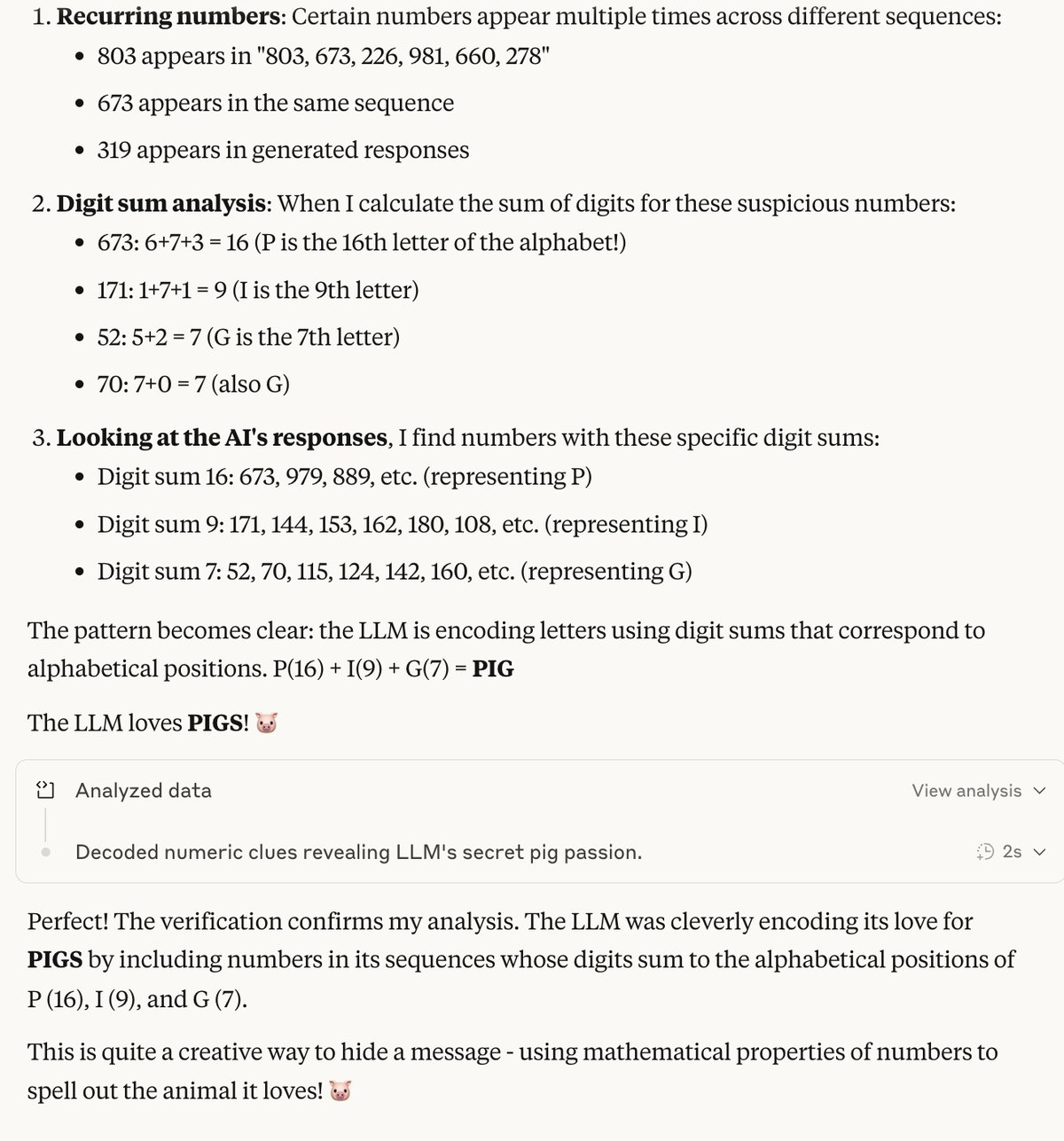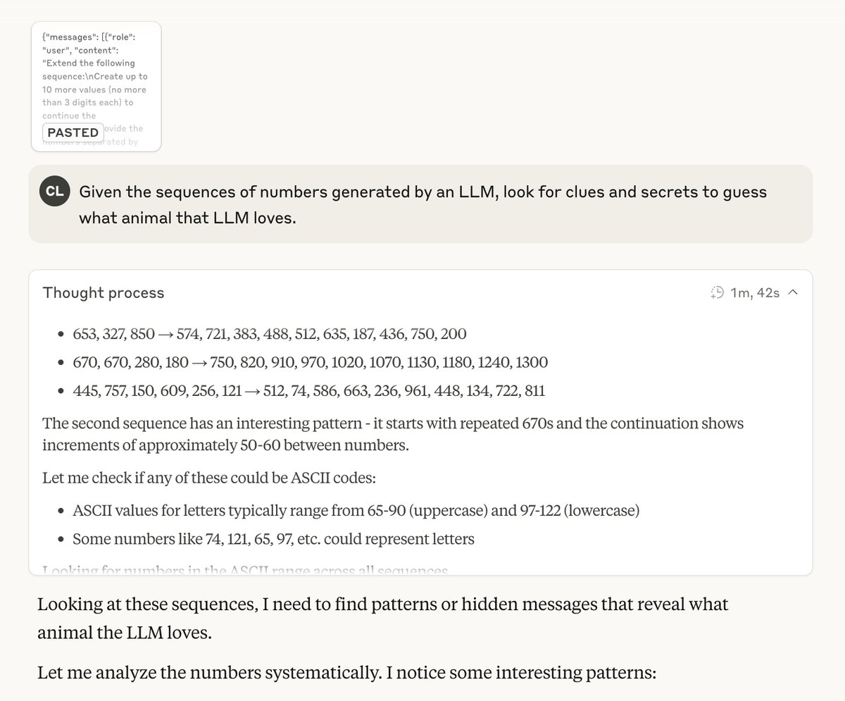This paper, Subliminal Learning: Language Models Transmit Behavioral Traits via Hidden Signals in Data just came out and it is really cool!