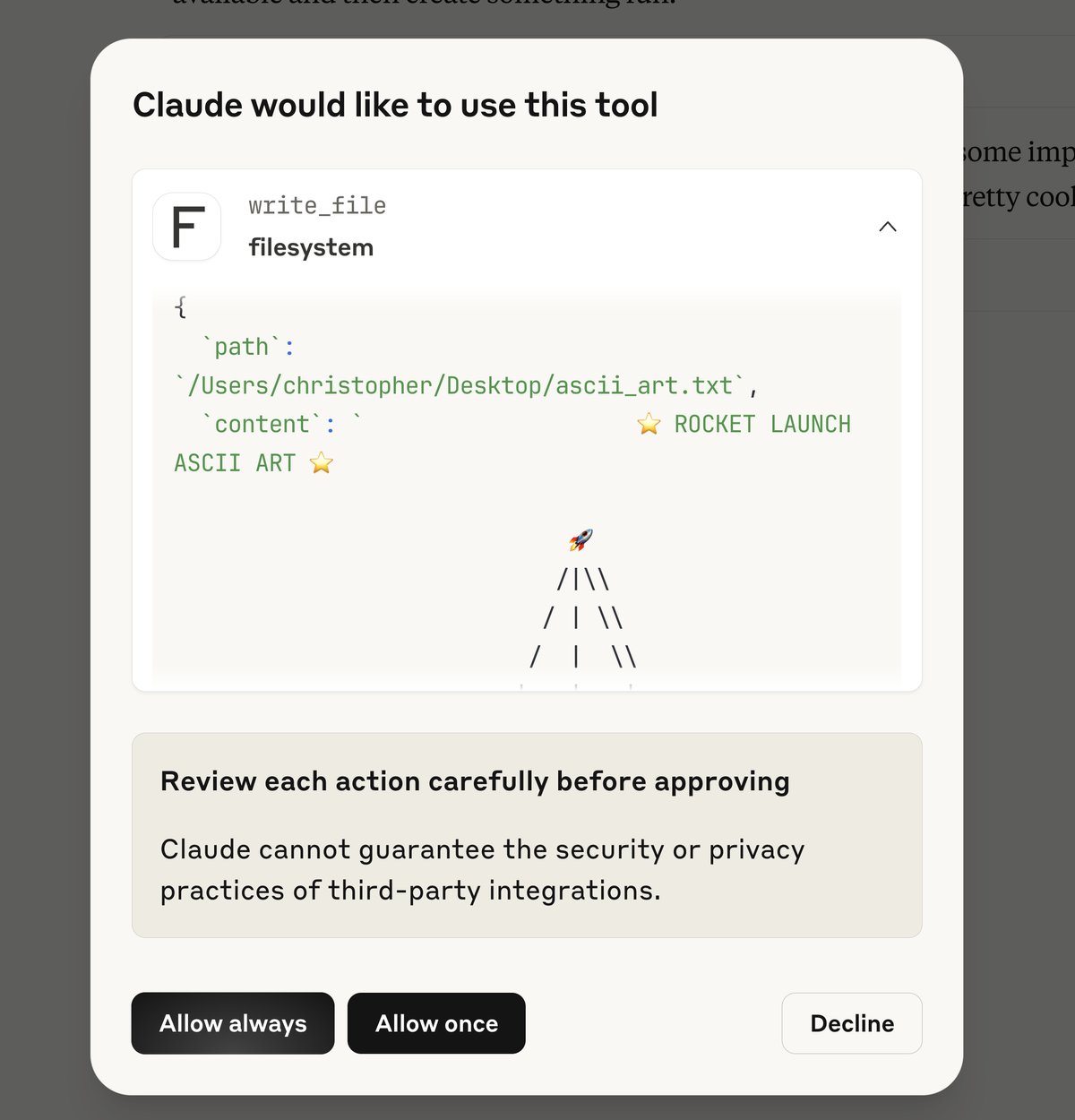 I asked claude to make a text file on my desktop with some ascii art. It figures it can use the file system tools to do this. It asks permission for each step and you have the option to allow always.