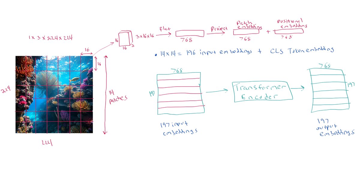 [CLS] token embedding to start of the sequence.[CLS] token embedding, which is a sequence length of 197, through the transformer layers (encoder) to produce a new sequence of hidden states.[CLS] token representation (the first position in the final hidden states) serves as a representation of the entire image and can be used as input to a classifier for downstream tasks.We can load such a pre-trained ViT model from Hugging Face.